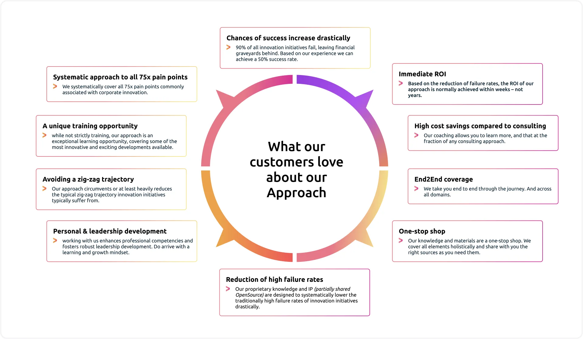We systematically cover all 75x pain points commonly associated with corporate innovation.