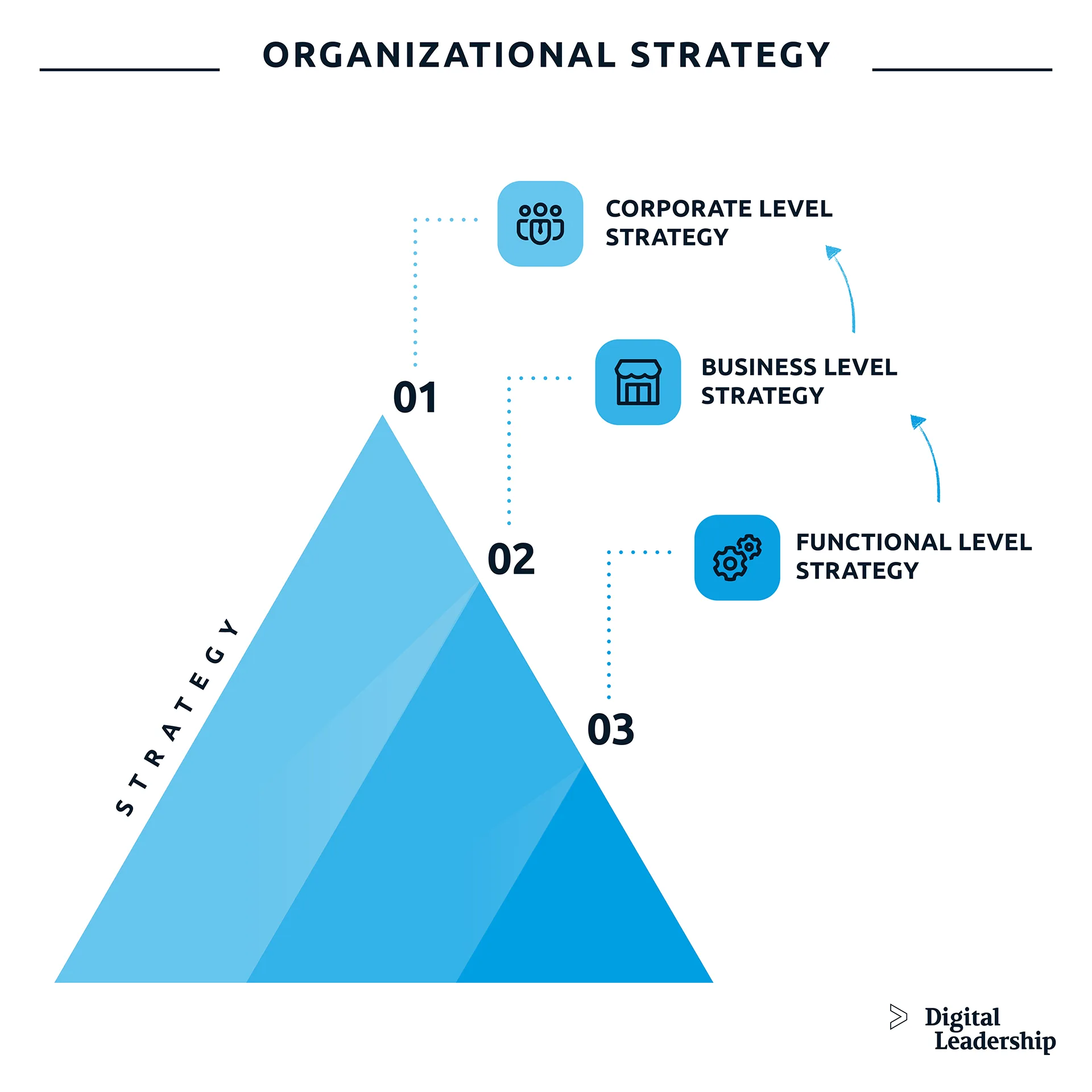 Part of Organizational Strategy includes understanding that there are three levels of business strategy. Each level has its own priorities and labor, but each level must still be working with the others toward achieving the overall goal.