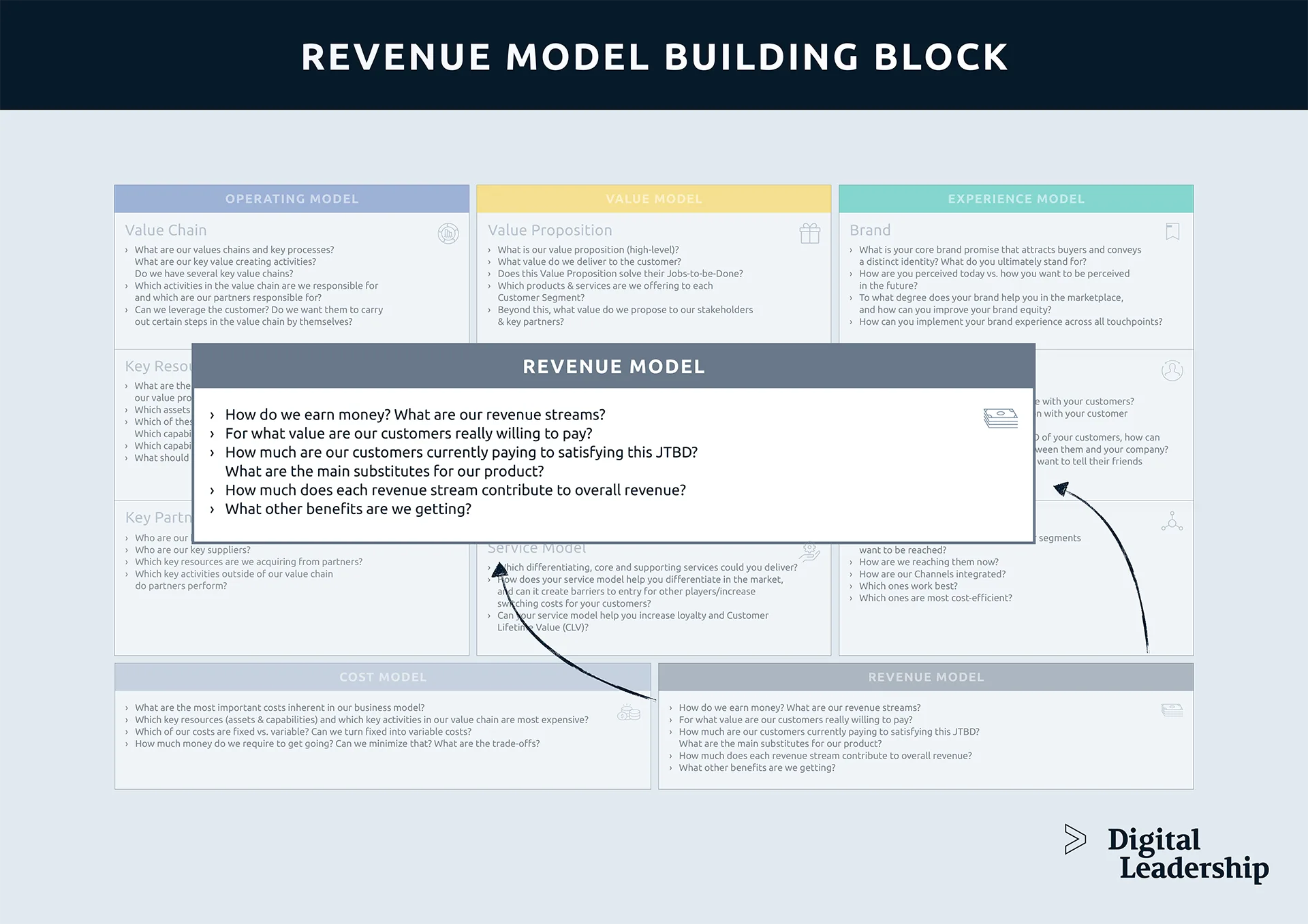 A Business Model can be broken out into numerous aspects. Depending on what challenges you face, you can zoom in on your area of interest using an appropriate tool or canvas: