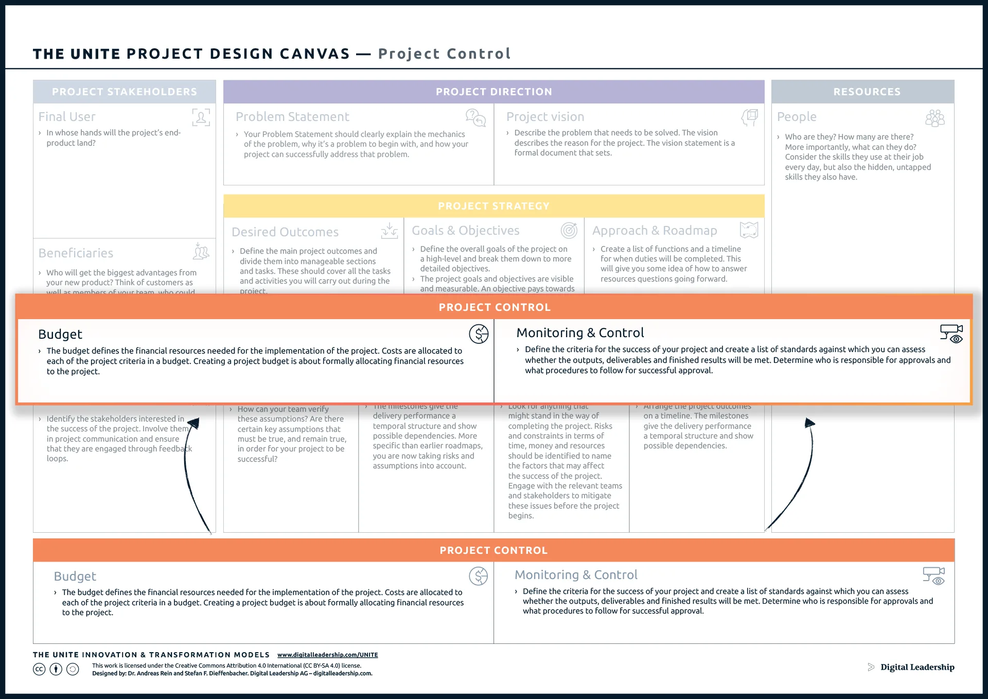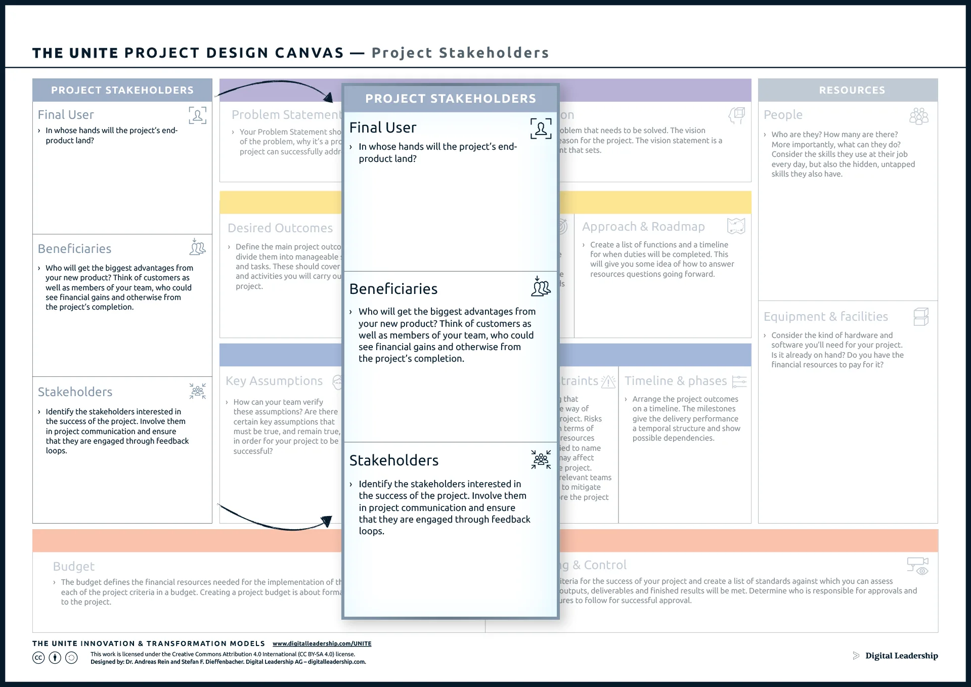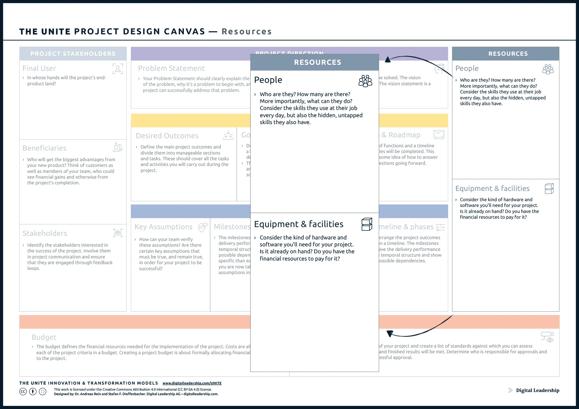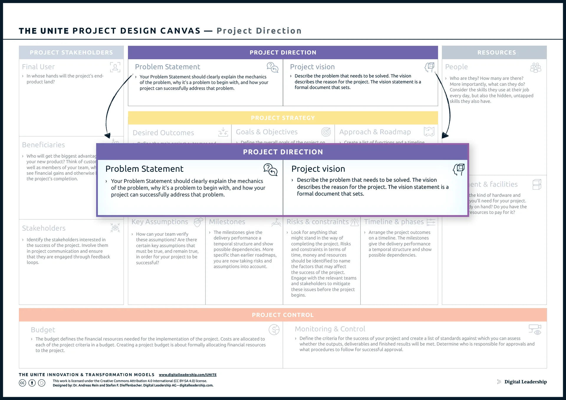 The experts at Digital Leadership created the UNITE Project Design Canvas as a part of our overall goal of helping businesses succeed through innovation. The UNITE approach to innovation is aimed at guiding businesses to gain new competitive advantages by reviewing their business practices and identifying areas of improvement and potential growth.