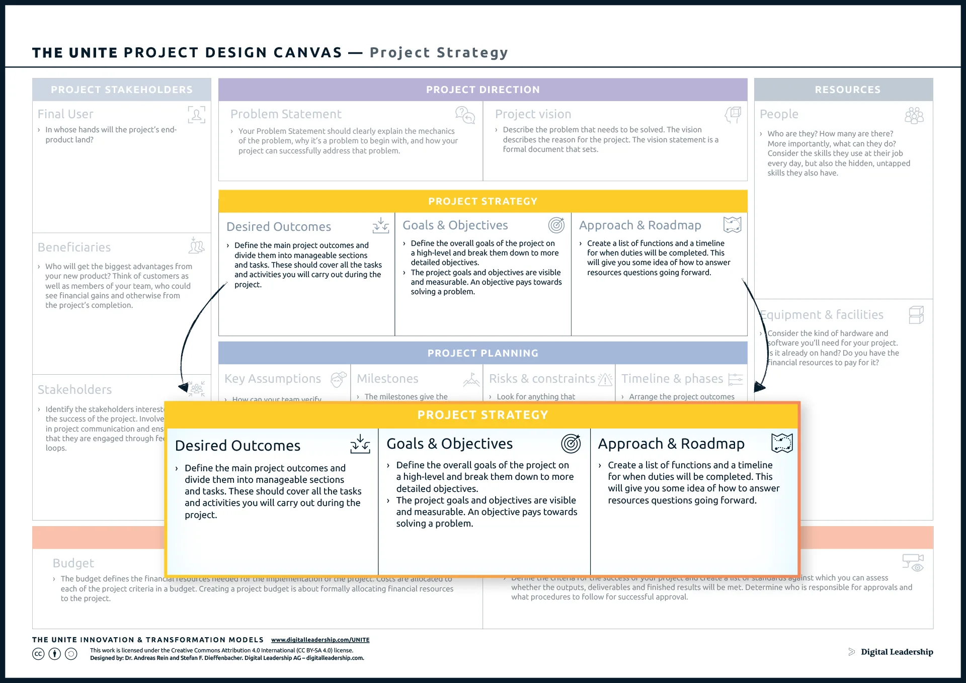 When you follow the pieces placed within the canvas, you’ll create a plan that includes all the vital elements necessary to help your project succeed. Below, we step through all the different sections of The UNITE Project Canvas.