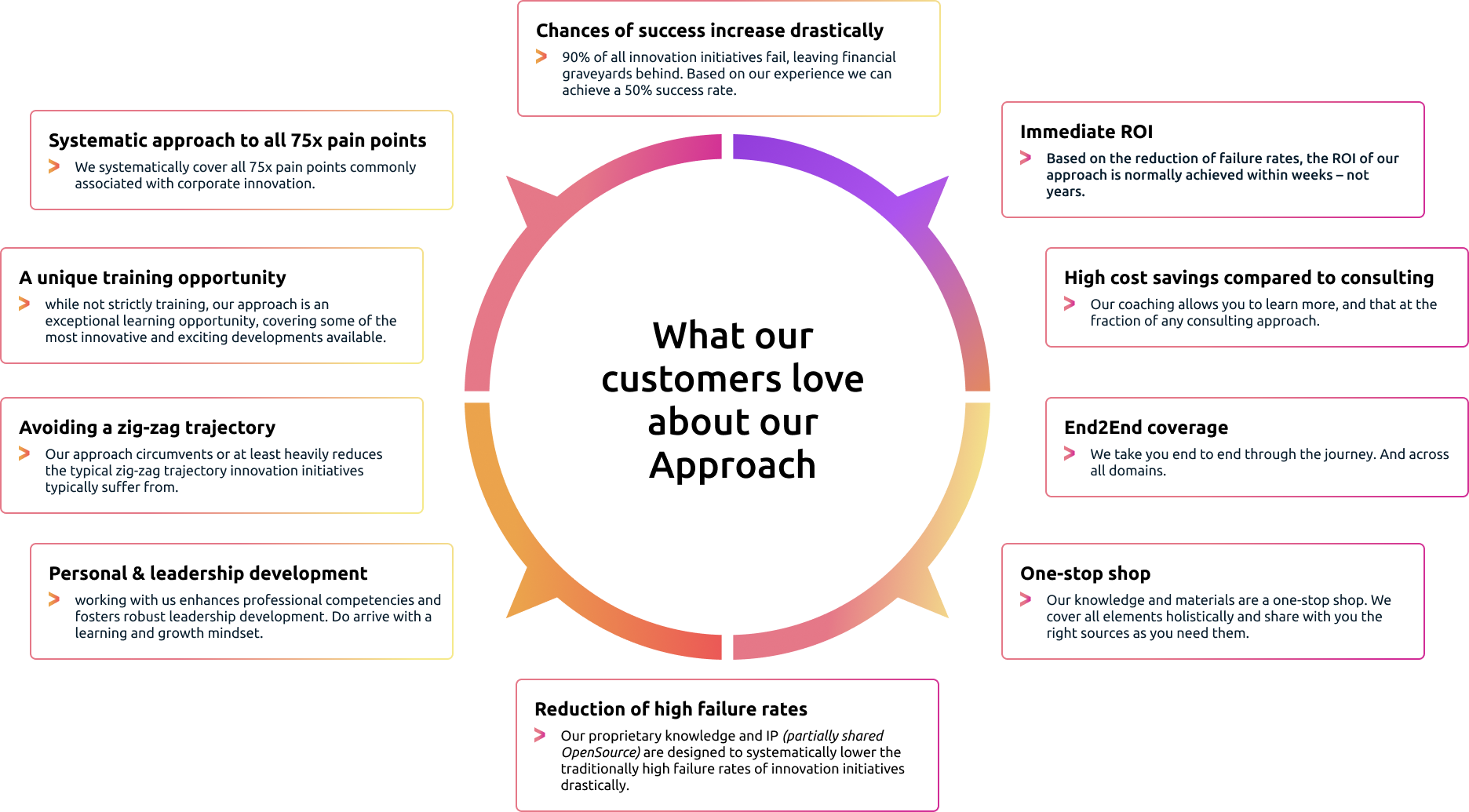 We systematically cover all 75x pain points commonly associated with corporate innovation.